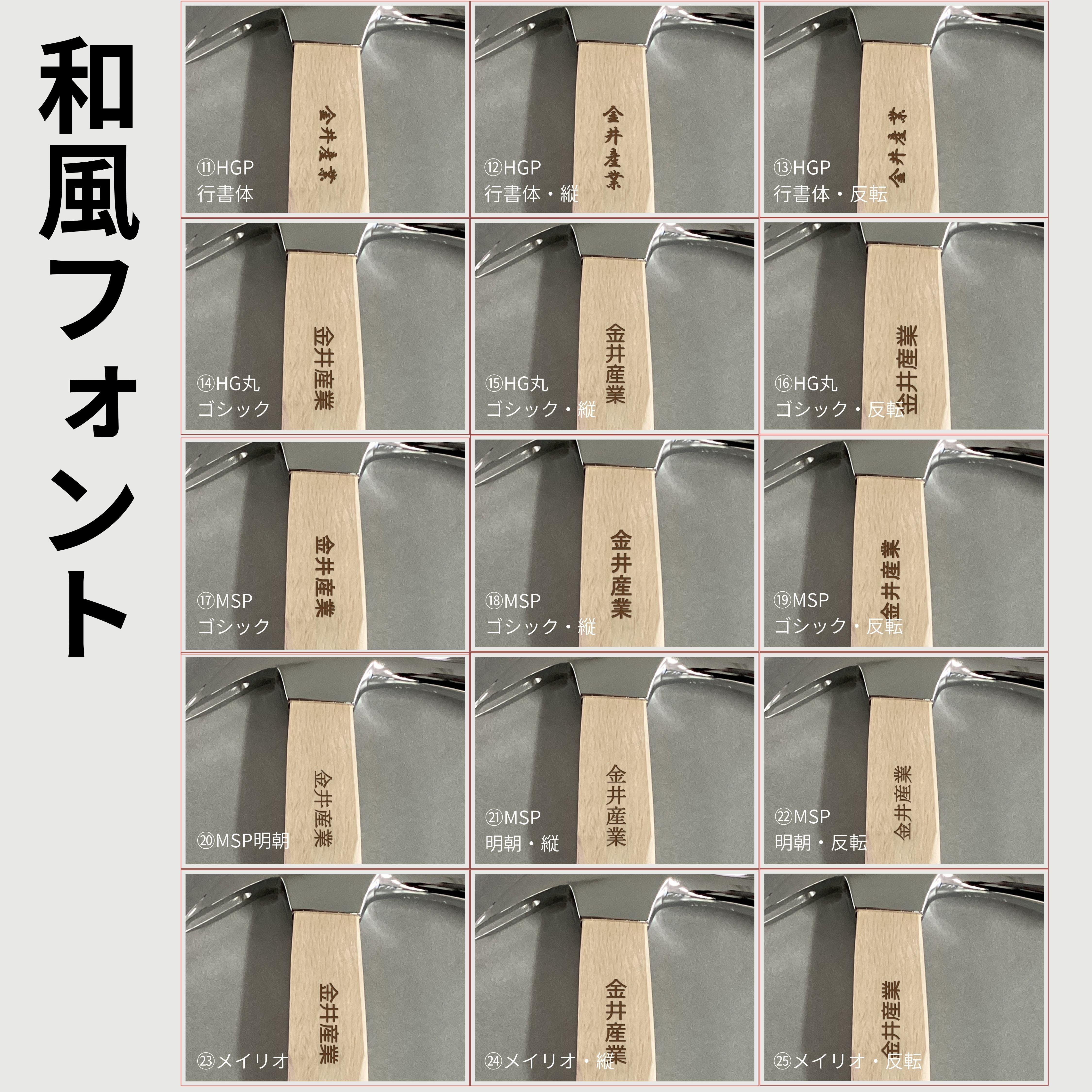 ※フォントは英文フォント、和文フォントいずれかからお選びいただけます。10種類の中からお選びいただき、名入れしたい文字とフォント番号を選択欄にご記入ください。文字数は10文字程度刻印可能です。和文フォントの場合、標準は横書きですが、縦書きも可能です。縦書きをご希望の方は選択項目にてご選択ください。