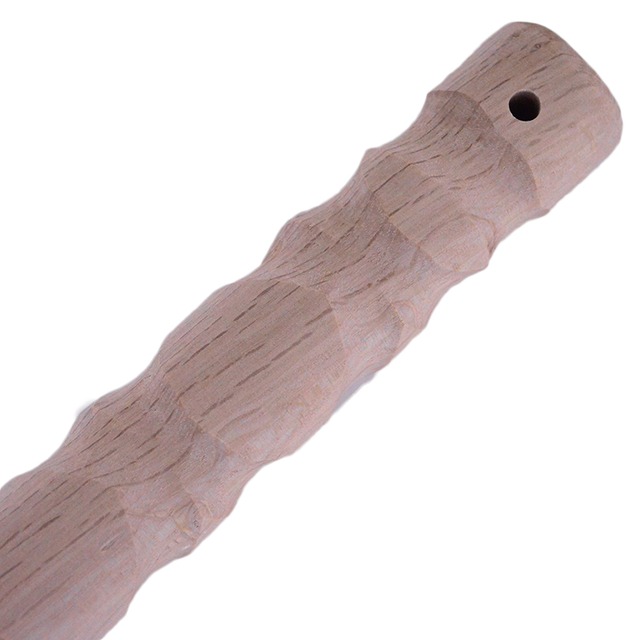 直線的な柄に左右交互からラセン状の溝を彫り込んだ特殊形状の凹凸が手にフィットし右利き左利きどちらでもしっくりする造り。