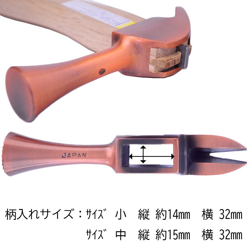 仮枠作業が必要になる様々なシーンで扱いやすいよう頭部はやや長いラッパな形状で、片側が打撃部、もう片側が釘抜き部となっています。